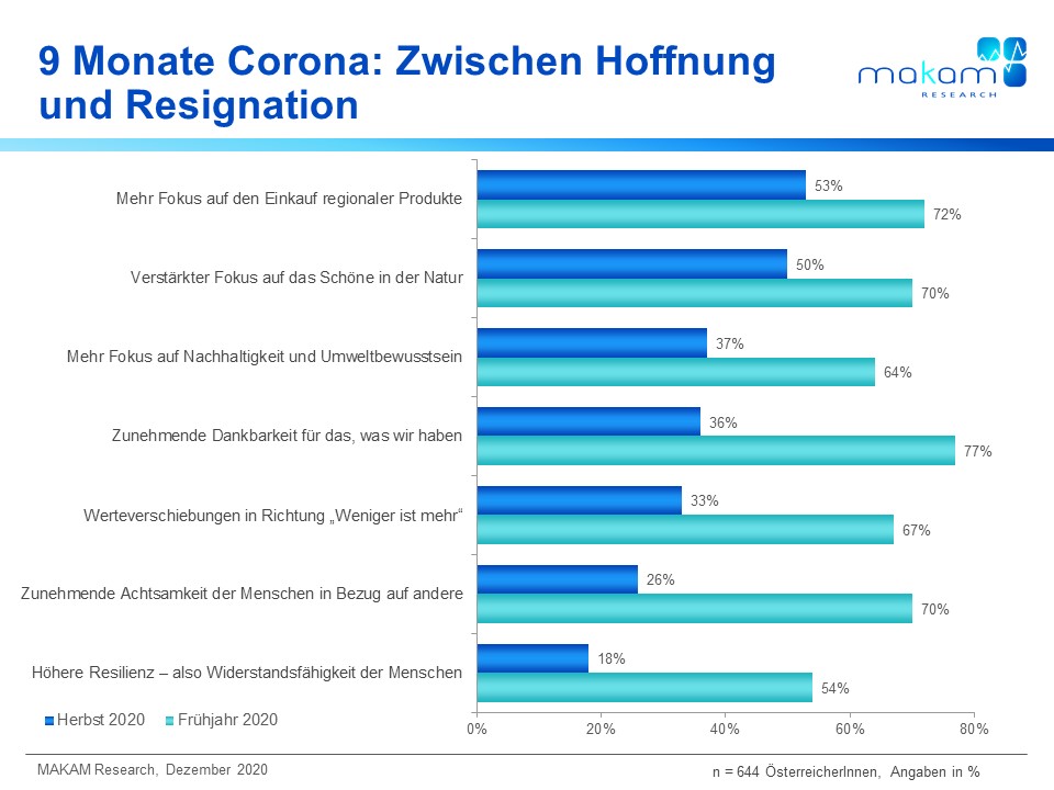 Die Hoffnung, dass die Menschen aufgrund der Krise resilienter werden, war im März noch bei mehr als der Hälfte der ÖsterreicherInnen ein Begleiter, jetzt erkennen nur mehr 18% eine zunehmende Widerstandsfähigkeit der Menschen.