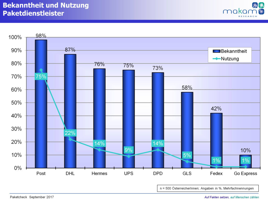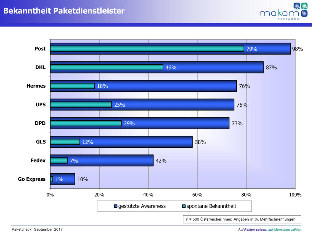 Geht man nach der Bekanntheit der Anbieter, ist die Österreichische Post AG mit einer gestützten Awareness von 98 % und einer spontanen Bekanntheit von 79 % mit Abstand der Branchen-Primus. Aber auch andere Paketzusteller haben hohe Bekanntheitswerte: Die deutsche Post-Tochter DHL 87 % (spontan 46 %), Hermes 76 % (spontan 18 %), UPS 75 % (spontan 25 %) und DPD 73 % (spontan 29 %).