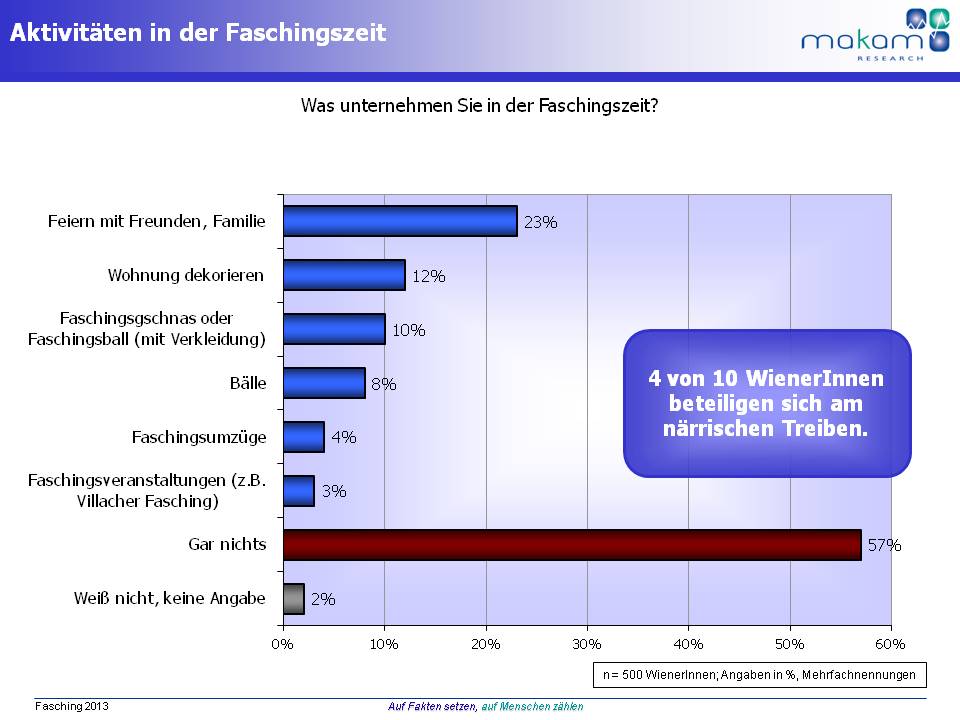 Etwa 4 von 10 WienerInnen lieben das bunte Faschingstreiben und besuchen heuer Faschingsfeste, Umzüge, Bälle oder veranstalten private Partys. Obwohl die Anzahl der Wiener Faschingsfetischisten seit 2010 kontinuierlich rückläufig ist (2010 setzten noch 60 % der WienerInnen Aktivitäten in der Faschingszeit, 2012 48 % und heuer nur noch 43 %), ist die Faschingszeit ein bedeutender Wirtschaftsfaktor für die Wiener Wirtschaft. So lassen sich die Wiener und Wienerinnen ihr närrisches Treiben heuer rund 29,5 Mio. Euro kosten. Durchschnittlich werden 51 Euro für Faschingskrapfen, Dekorationsmaterial, Kostüme, Eintrittskarten und bei diversen Faschingsveranstaltungen ausgeben. Männer greifen dabei tiefer in die Geldbörse als Frauen. Während Frauen im Durchschnitt 45 Euro investieren, lassen sich Männer den Spaß sogar fast 58 Euro kosten.