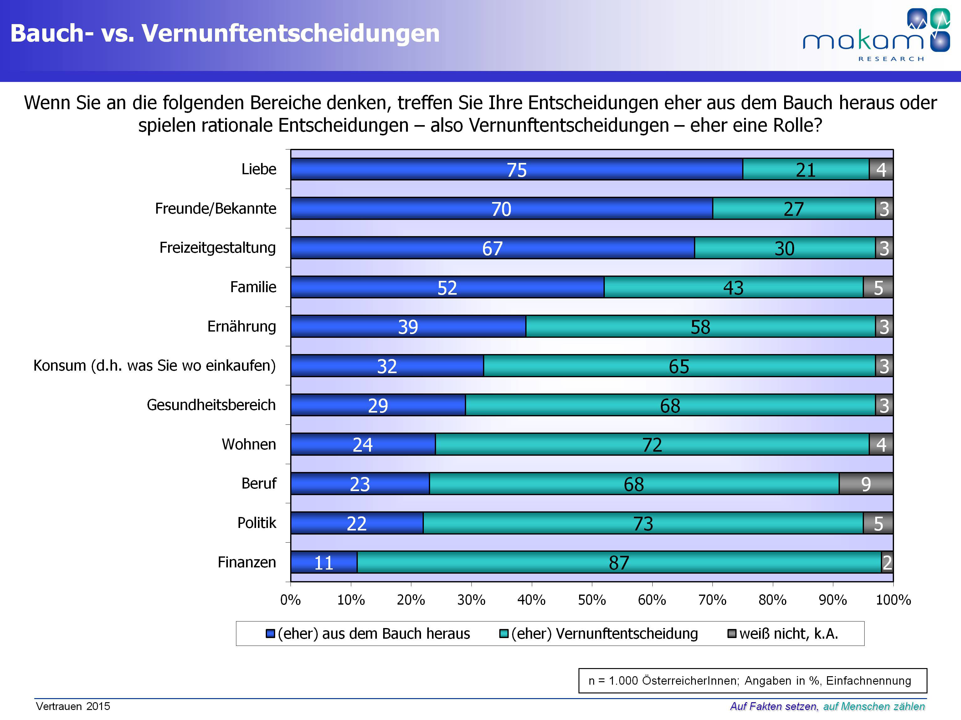 In einer aktuellen Studie hat MAKAM Research die ÖsterreicherInnen repräsentativ gefragt, in welchen Bereichen sie eher ihrem Bauchgefühl vertrauen und wo eher Vernunftentscheidungen getroffen werden.