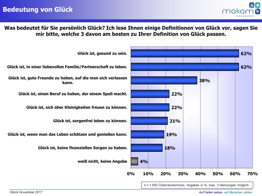 Glück ist für viele Menschen das höchste Lebensziel. Es ist etwas, das käuflich nicht zu erwerben ist, aber auch nicht mit Disziplin und Zwang zu erreichen ist. Was bedeutet Glück für die ÖsterreicherInnen?