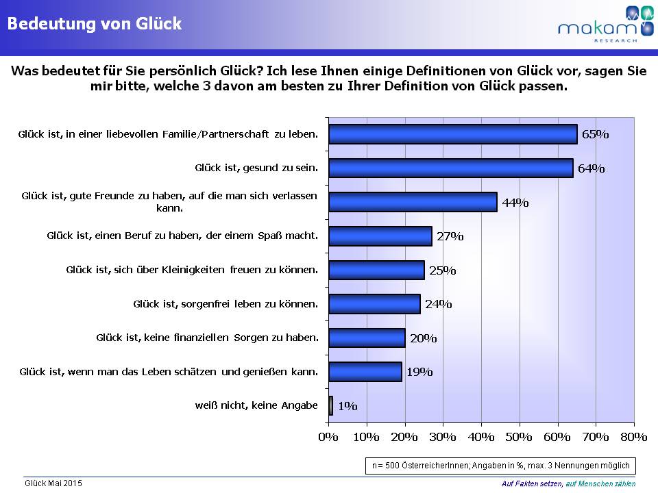 Knapp zwei Drittel der ÖsterreicherInnen sind sich einig, dass Glück für sie darin besteht, in einer liebevollen Familie bzw. Partnerschaft zu leben. Verheiratete bzw. in Partnerschaft lebende ÖsterreicherInnen stimmen dieser Glücksdefinition häufiger zu. Ebenso ist die Gesundheit für knapp zwei Drittel ein wichtiger Faktor, um glücklich zu sein, tendenziell Ältere definieren Glück häufiger darüber. Für 44 % besteht Glück darin, Freunde zu haben, auf die man sich verlassen kann.