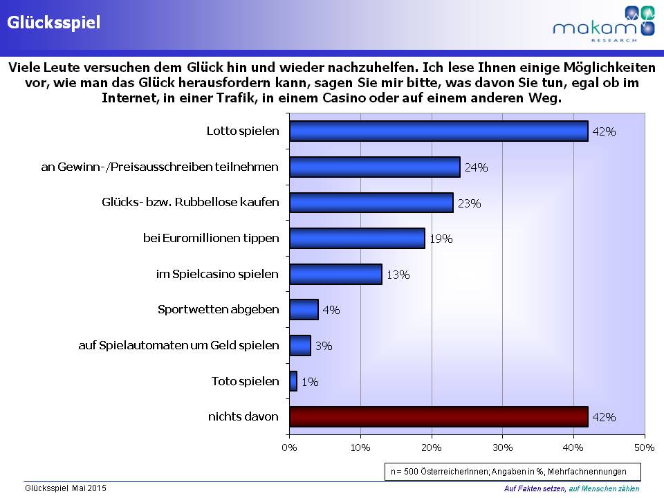 Es gibt viele Möglichkeiten und Wege, das Glück herauszufordern. Wie eine aktuelle Studie von MAKAM Research zeigt, beteiligen sich 6 von 10 ÖsterreicherInnen an verschiedensten Arten von Glücksspielen, um ihrem Glück auf die Sprünge zu helfen und vielleicht den langersehnten Jackpot zu knacken.