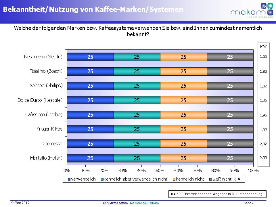 Die VerwenderInnenanteile liegen bei diesen Marken jedoch weit hinter jenen von Nespresso. So verwenden 8 % Cafissimo von Tchibo, je 4 % Tassimo von Bosch, Senseo von Philips und Martello von Hofer.