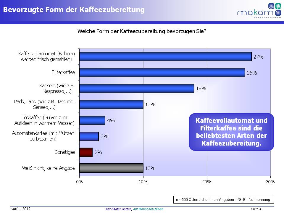 27 % der ÖsterreicherInnen bevorzugen bei der Kaffeezubereitung einen Kaffeevollautomaten, bei dem die Bohnen frisch gemahlen werden. Häufiger Berufstätige greifen auf diese Art der Zubereitung zurück. Knapp dahinter rangiert der traditionelle Filterkaffee, der vor allem von über 60-Jährigen, Nicht-Berufstätigen und Personen ohne Kinder im Haushalt geschätzt wird. 18 % verwenden am liebsten Kapseln. Jede/r Zehnte bevorzugt die Zubereitung mit Tabs bzw. Pads und 4 % verwenden Löskaffee, bei dem Pulver in heißem Wasser aufgelöst wird. 3 % favorisieren Automatenkaffee, bei dem auf Wunsch gleich Milch und Zucker beigemengt werden kann.