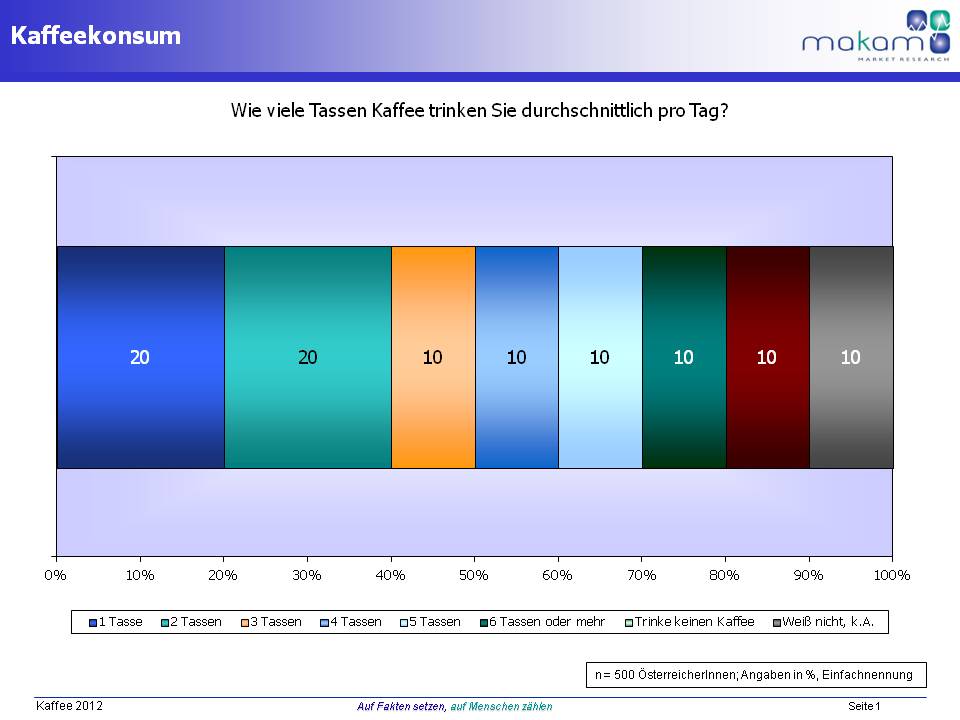 2 von 10 genießen täglich eine Tasse Kaffee, wobei sich häufiger Frauen auf eine einzige Tasse beschränken. Ein Viertel trinkt 2 Tassen täglich, 18 % 3 Tassen und 21 % sogar 4 oder mehr Tassen. 15 % der ÖsterreicherInnen trinken nie Kaffee. Männer und tendenziell unter 30-Jährige gehören etwas häufiger zur Gruppe der Kaffee-Verweigerer.