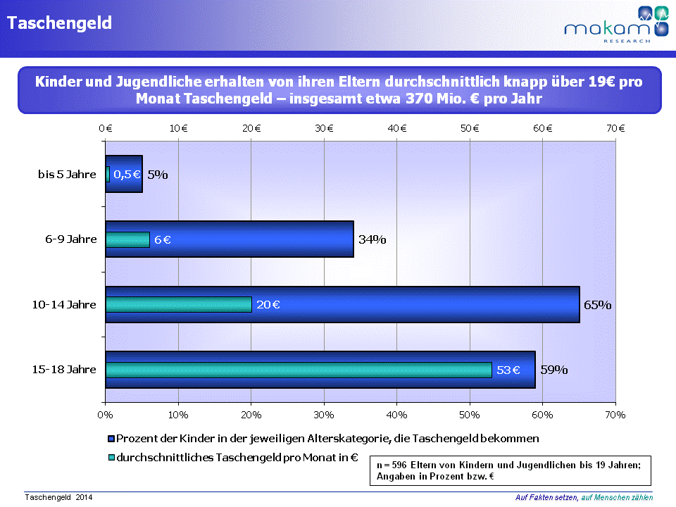 Während nur 5 % der bis 5-Jährigen in den Genuss eines regelmäßigen Taschengeldes kommen, sind es 34 % der 6- bis 9-Jährigen und sogar 65 % der 10- bis 14-Jährigen. Danach sinkt der Anteil der TaschengeldbezieherInnen wieder leicht auf 58 %, was mit der Berufstätigkeit einiger Jugendlicher in der Altersgruppe der 15- bis 18-jährigen Teenies zusammenhängt. Dies geht aus der aktuellen MAKAM Research-Umfrage hervor, bei der 596 Eltern mit Kindern unter 19 Jahren befragt wurden.