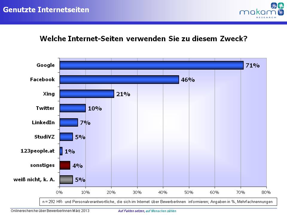 71 % der PersonalistInnen nutzen Google als Quelle für Recherchen rund um BewerberInnen. Auch Social Media-Plattformen sind beliebte Quellen, um Informationen über BewerberInnen einzuholen: Über Facebook informieren sich 46 %, über Xing 21 % und jede/r Zehnte nutzt Twitter für die Recherche. 7 % ziehen LinkedIn zu Rate und 5 % StudiVZ.