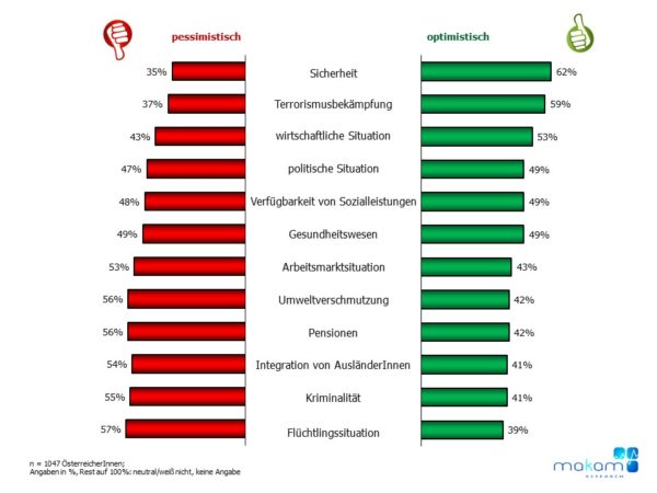 Etwa 6 von 10 ÖsterreicherInnen blicken hinsichtlich Sicherheit, Terrorismusbekämpfung und wirtschaftlicher Lage in unserem Land optimistisch in die Zukunft. Sorgen macht vielen ÖsterreicherInnen hingegen die Flüchtlingssituation, die Umweltverschmutzung und die Verfügbarkeit von Pensionen. Das geht aus einer von MAKAM Research durchgeführten top aktuellen repräsentativen Befragung der österreichischen Bevölkerung hervor.
