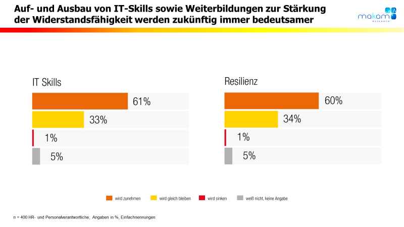 Der Trend zu Digitalisierung zeigt sich auch deutlich an der stark zunehmenden Bedeutung von Weiterbildungen zum Auf- und Ausbau von IT-Skills. 6 von 10 Unternehmen in Österreich schreiben diesem Weiterbildungsbereich eine zunehmende Bedeutung zu, genauso viele wie zukünftig Maßnahmen zur Stärkung der Resilienz zunehmend als wichtig erachten.