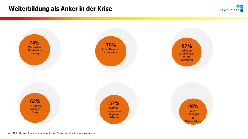 Weiterbildung spielt eine prägende Rolle in einer Krise: Für knapp 3/4 ist sie wichtig für die Mitarbeiterbindung, 70% sehen sie als „Mut-Macher“ und für 63% ist Weiterbildung essentiell, um den Erfolg eines Unternehmens auch nachhaltig zu sichern. 2/3 finden, dass in Krisenzeiten generell mehr in Weiterbildung investiert werden soll.