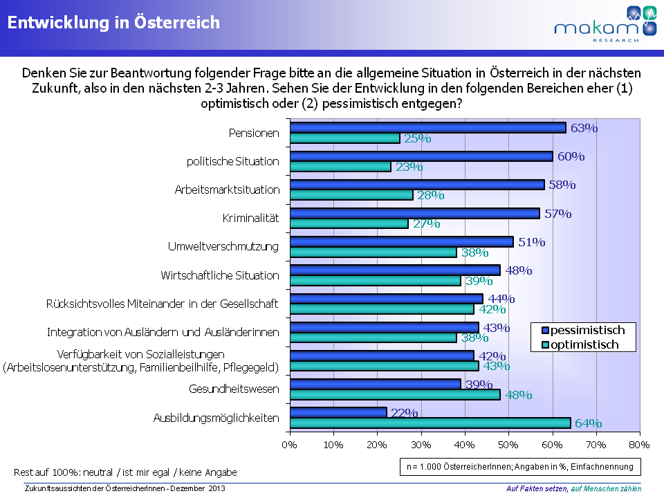94 % der ÖsterreicherInnen sehen den Entwicklungen in zumindest einem Bereich pessimistisch entgegen. Vor allem die Entwicklungen im Bereich Pensionen, in der Politik, am Arbeitsmarkt und in der Kriminalität bereiten den ÖsterreicherInnen Kopfzerbrechen. Vergleichsweise hoffnungsvoller sind WestösterreicherInnen, Männer und unter 30-Jährige. Dies ergibt eine aktuelle repräsentative Bevölkerungsbefragung von MAKAM Research unter 1.000 ÖsterreicherInnen ab 16 Jahren.